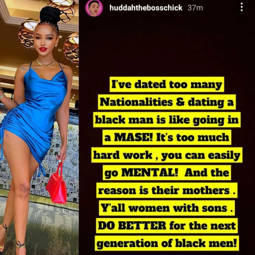 “I’ve dated too many nationalities and dating a black man is like going in a maze. It’s too much hard work. You can easily go mental! And the reason is their mothers. Y’all women with sons. Do better for the next generation of black men.”