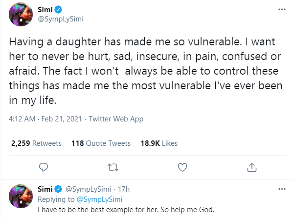 The songstress went on to state that she wants to be the best example to her daughter. Simi tweeted;