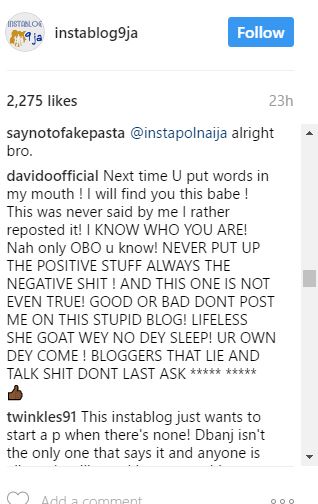 “davidoofficial Next time U put words in my mouth ! I will find you this babe ! This was never said by me I rather reposted it! I KNOW WHO YOU ARE! Nah only OBO u know! NEVER PUT UP THE POSITIVE STUFF ALWAYS THE NEGATIVE SHIT ! AND THIS ONE IS NOT EVEN TRUE! GOOD OR BAD DONT POST ME ON THIS STUPID BLOG! LIFELESS SHE GOAT WEY NO DEY SLEEP! UR OWN DEY COME ! BLOGGERS THAT LIE AND TALK SHIT DONT LAST ASK ***** ***** ??”