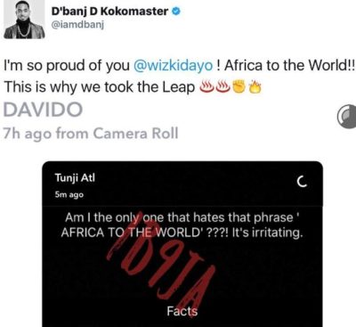 Instablog, yesterday shared a screenshot of a snap from Tunji atl, who said he is not a fan of D’banj’s famous tweet to Wizkid: “I am so proud of you @wizkidayo! Africa To The World!!!,” a post that got the attention of Davido, who actually “reposted” it and said “Facts”. Thus making it look like Davido endorsed his post.