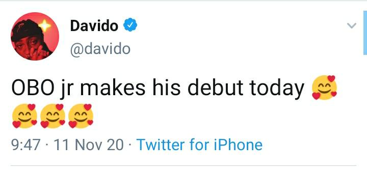 Davido had taken to his Twitter page in the early hours of today, November 11th to reveal that OBO Jr will be making his first appearance today.
