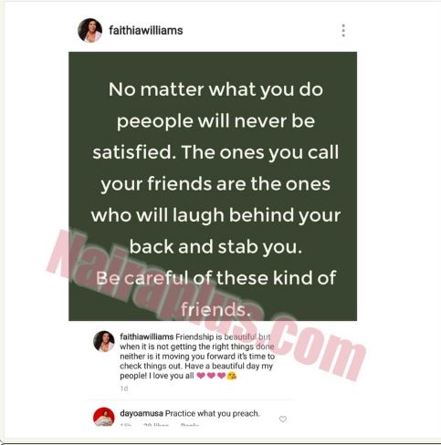 It happened that Fathia had taken to her Instagram page to warn people about a certain kind of friends.