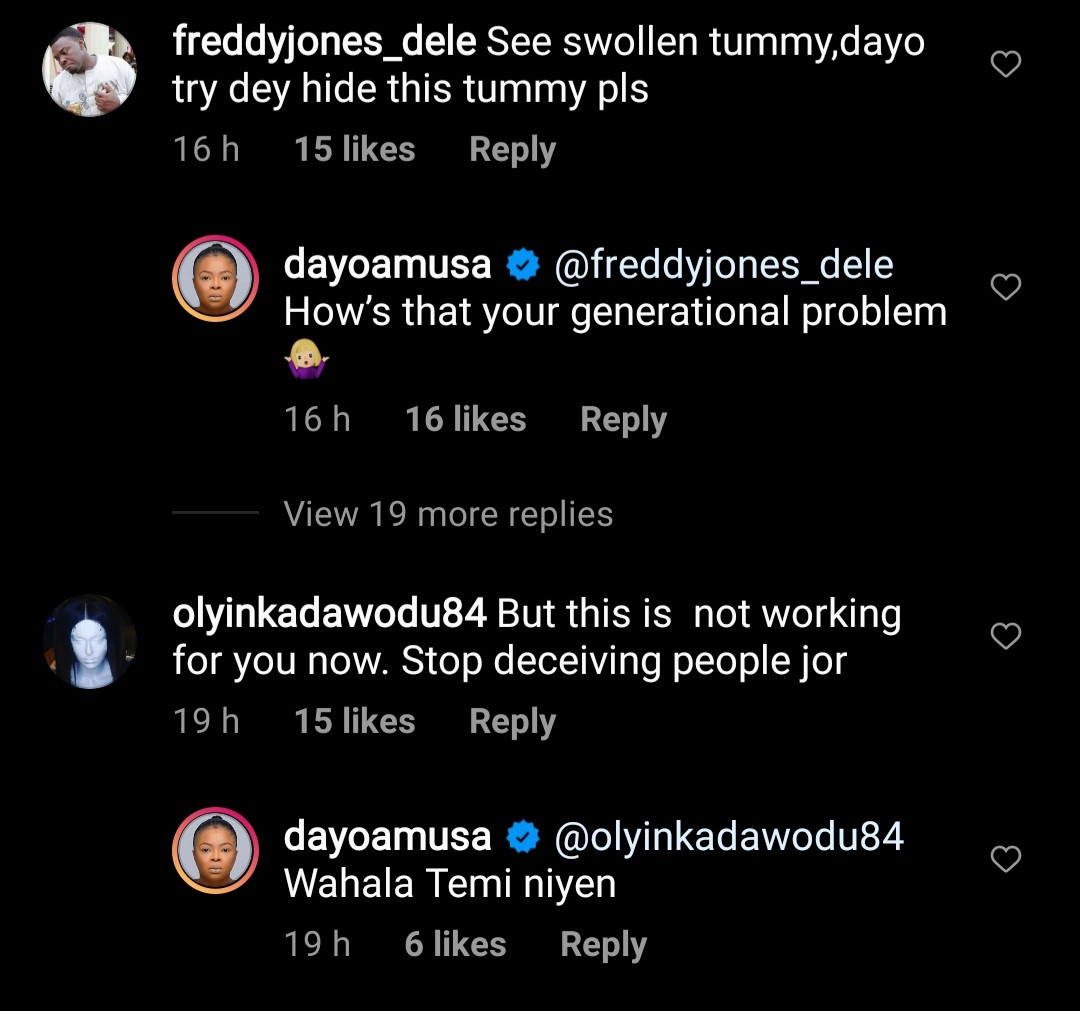 Reacting to the trolls, Dayo said her body weight is her problem, not theirs.