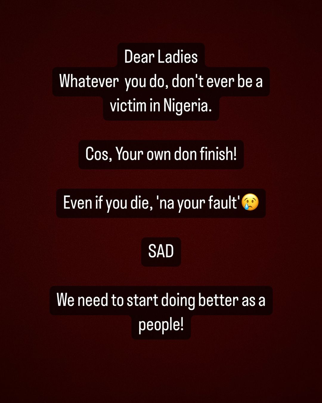 “Dear Ladies whatever you do, don’t ever be a victim in Nigeria. Cos your own don finish! Even if you die, ‘na your fault’ Sad we need to start doing better as a people. We need to reset our minds.”