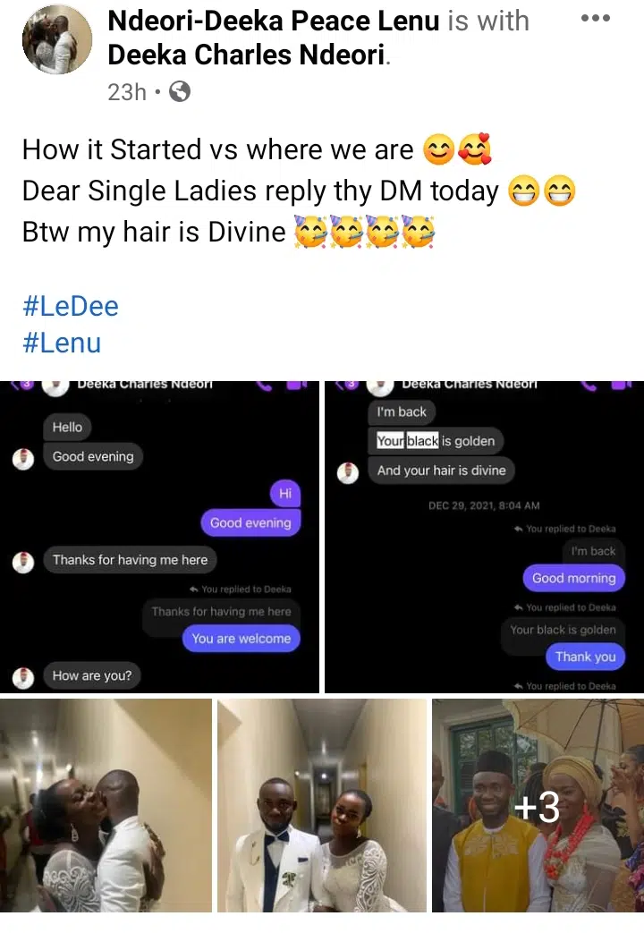 She shared adorable photos from her wedding, alongside screenshots of their first ever conversation on Instagram in 2021.