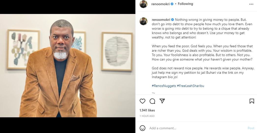 Former Presidential Aide and author, Reno Omokri has a word for people who go into debt in a bid to show their love to someone.