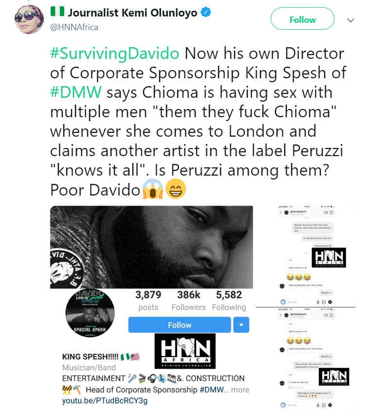 #SurvivingDavido Now his own Director of Corporate Sponsorship King Spesh of #DMW says Chioma is having sex with multiple men “them they fuck Chioma” whenever she comes to London and claims another artist in the label Peruzzi “knows it all”. Is Peruzzi among them? Poor Davido??