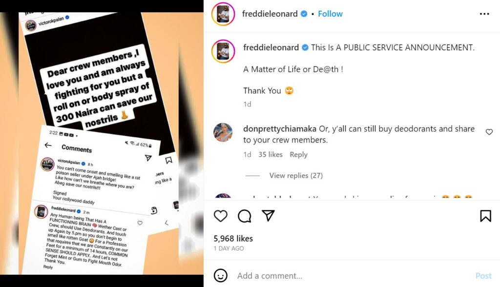 Popular Nollywood actor and filmmaker, Frederick Leonard, has taken to social media to tackle movie crew members with offensive body odor.