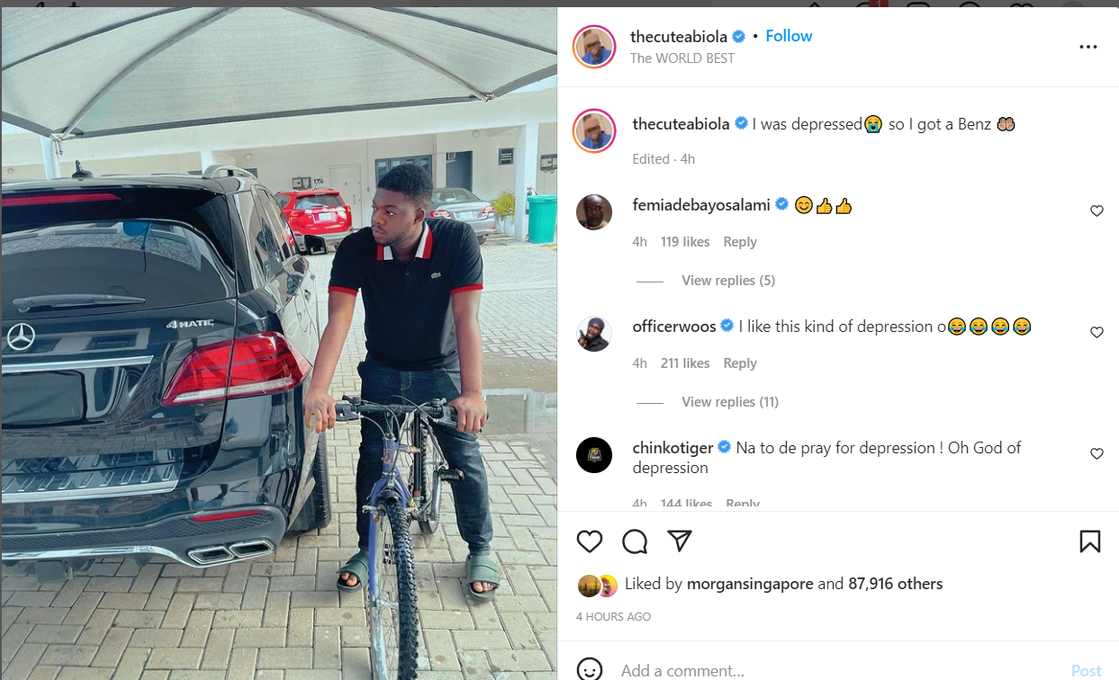 Sharing a photo of the luxury whip, Cute Abiola revealed he bought the car because he was depressed.