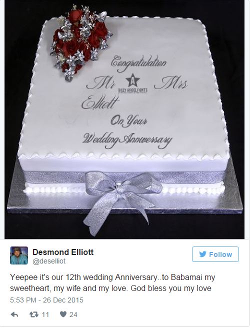 Yesterday, December 26 marked the 12th wedding anniversary of Nollywood actor turned politician, Desmond Elliot and his wife, Victoria Elliot. The excited lawmaker took to Twitter to share a post in celebration of the day. See The Tweet Below…