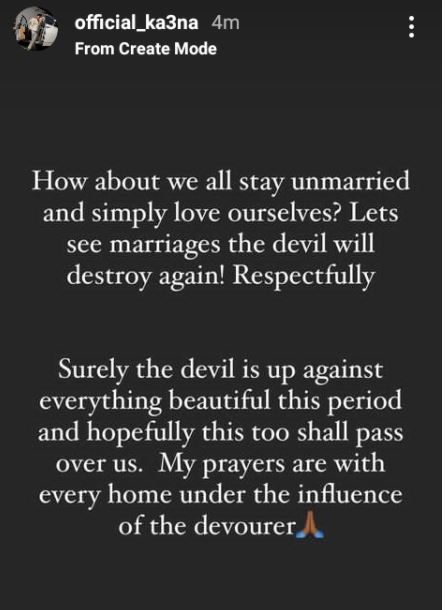 “How about we all stay unmarried and simply love ourselves? Le’t see marriages the devil will destroy again. Respectfully. Surely the devil is up against everything beautiful this period and hopefully this too shall pass over us. My prayers are with every home under the influence of the devourer.” She wrote.