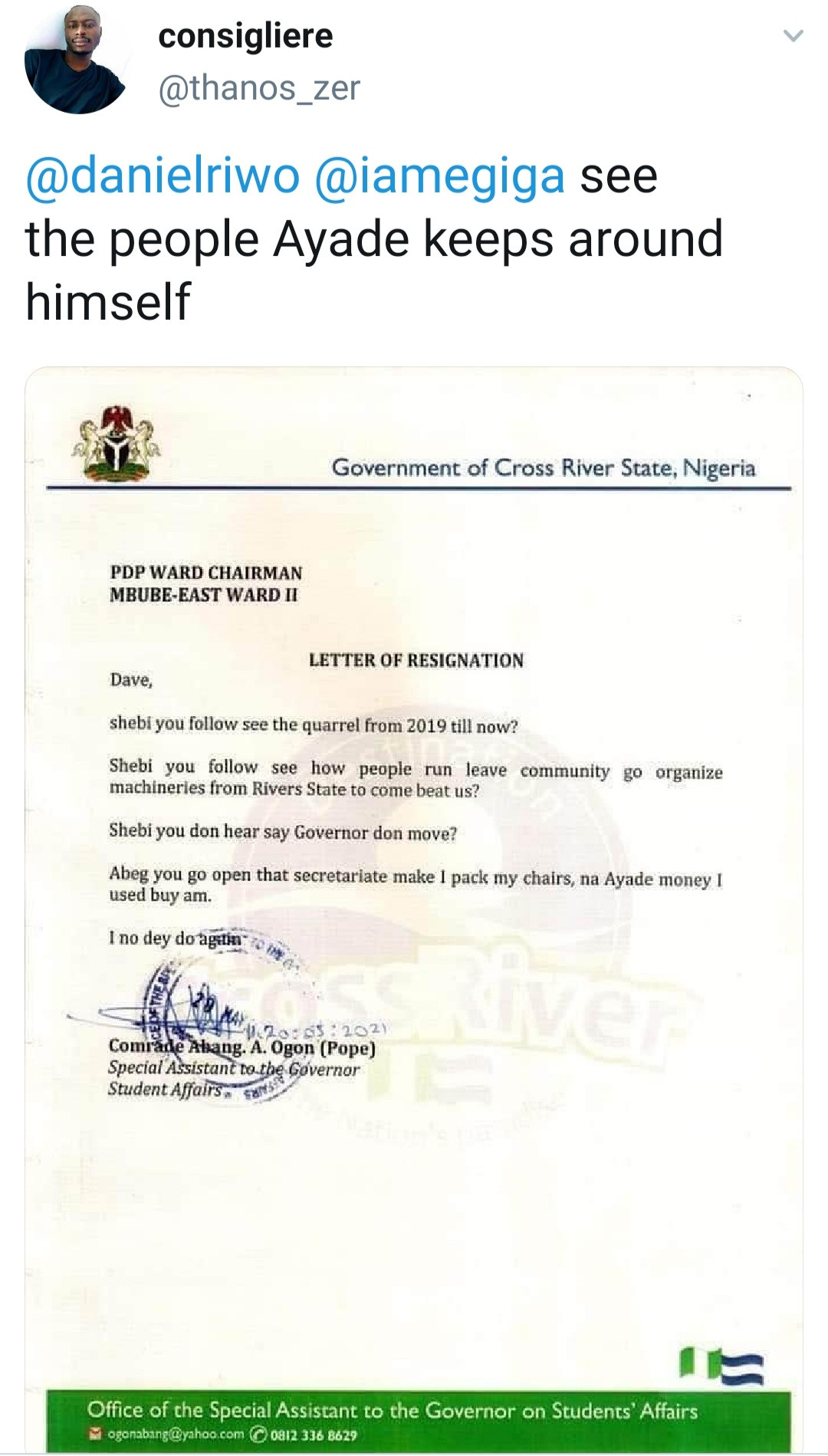 In the letter written in Pidgin English and addressed to the PDP ward chairman, Mbube-East ward II, Abang Ogon explained why he’s leaving the party.