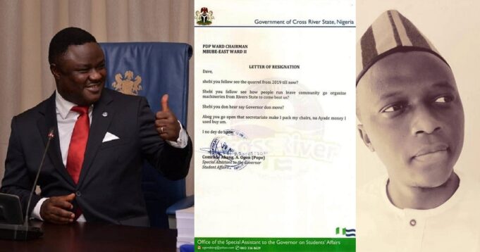 Abang Ogon, the Special Assistant to the Governor of Cross Rivers State on Student Affairs, has requested to resign from his position, following Ben Ayade’s defection from PDP to APC.