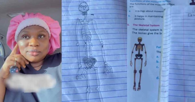 Sharing on TikTok, the woman @thesocialmedia_mum revealed that her daughter was given an assignment from school to draw a skeleton, so she gave assistance by exhibiting her artistic talents.