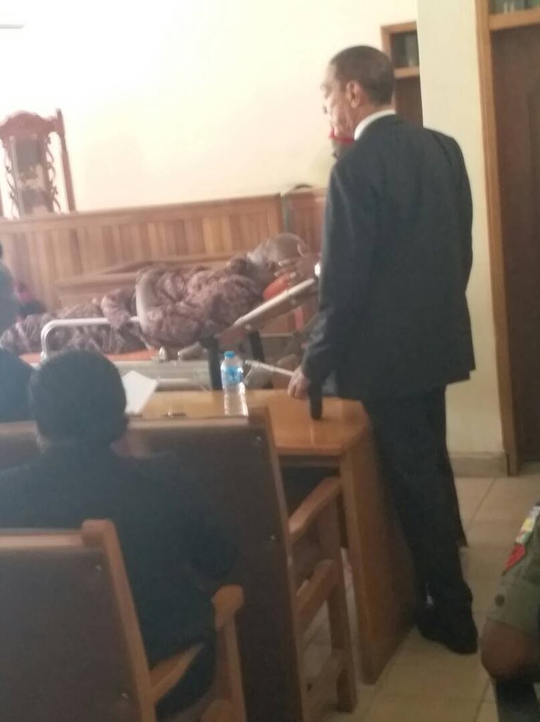 Melaye laid on a stretcher when he was produced in court in a police ambulance with registration number NPF2214D on Wednesday.