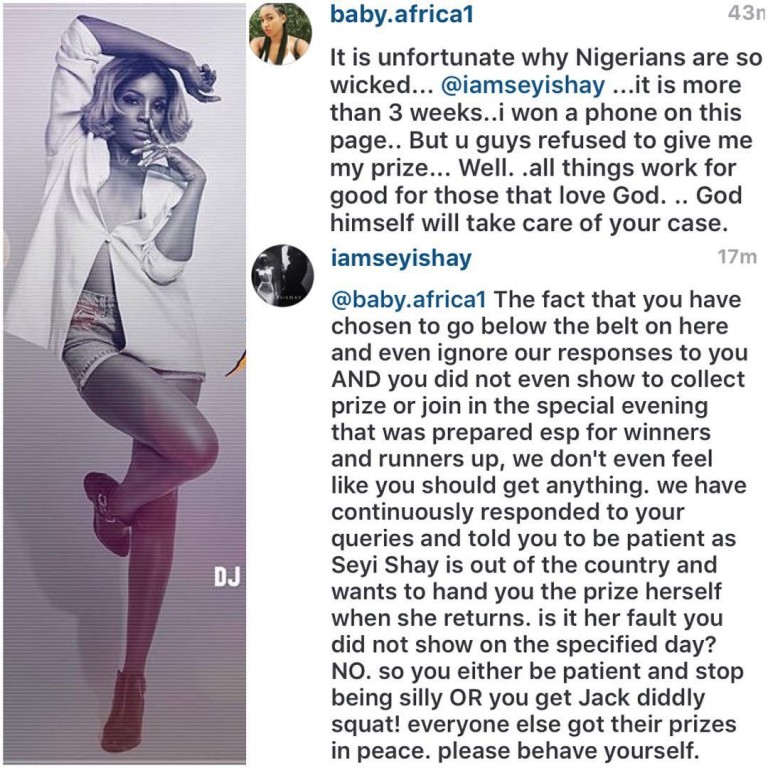 A really pissed off fan of Seyi Shay has accused the singer of refusing to send the prize – a mobile phone she won in Seyi or Shay Instagram Karaoke competition.