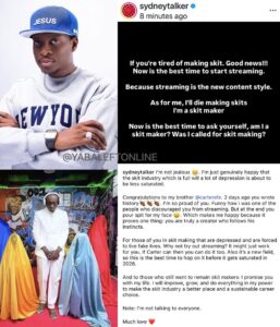 The comedian also encouraged skit makers who feel pressured or unhappy in the industry to explore streaming as an alternative, adding that the field is still emerging and presents opportunities for growth before it becomes saturated.