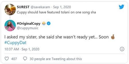 A Twitter user @savekaram tweeted that Cuppy should have featured Tolani on the album and cuppy in response explained why her sister wasn’t featured on the album.