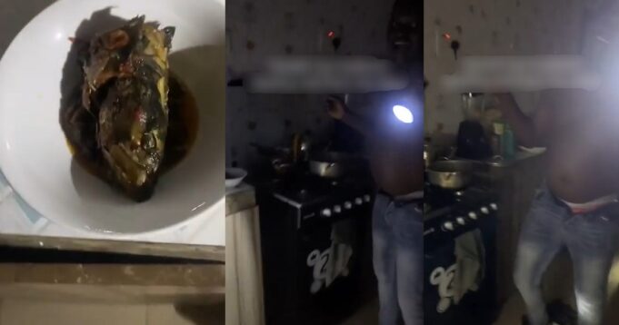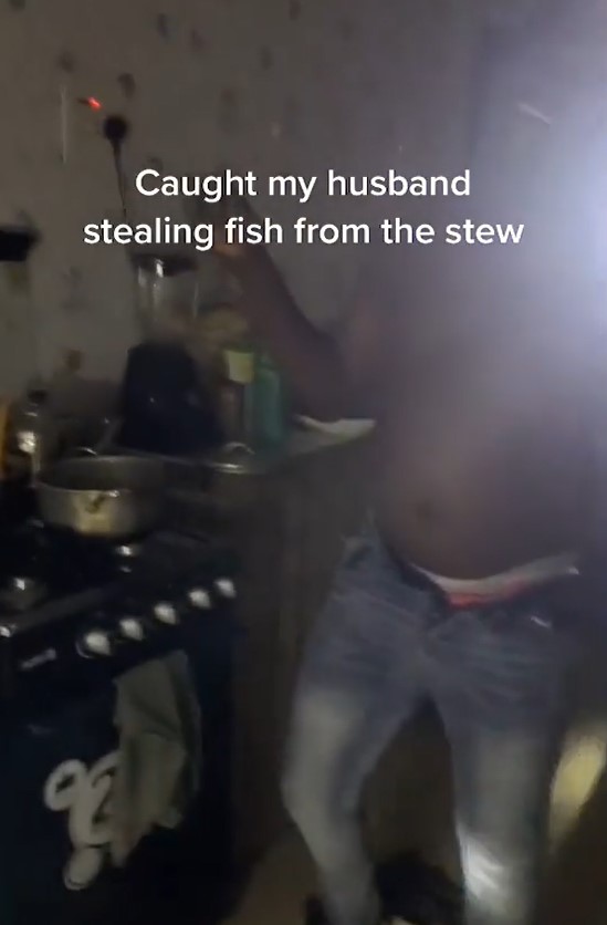 In the quite funny video that’s been serving rounds on the internet, the creeping husband was nabbed in the kitchen, holding a flash light to enable him see the fish he was about to take from the pot.