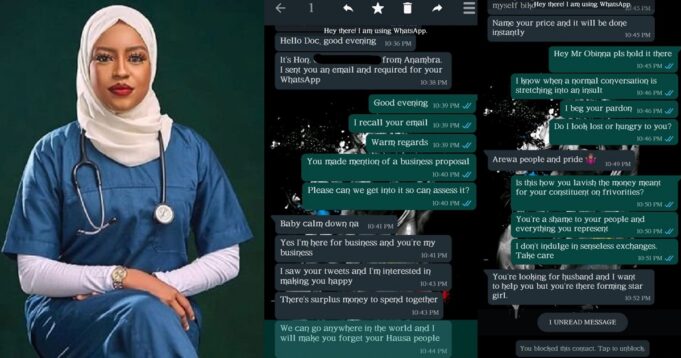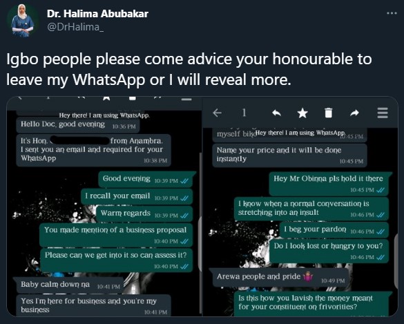 A Nigerian doctor identified on Twitter as Dr. Halima, has taken to the micro-blogging platform to call out an alleged lawmaker from Anambra state who wooed her via DM.