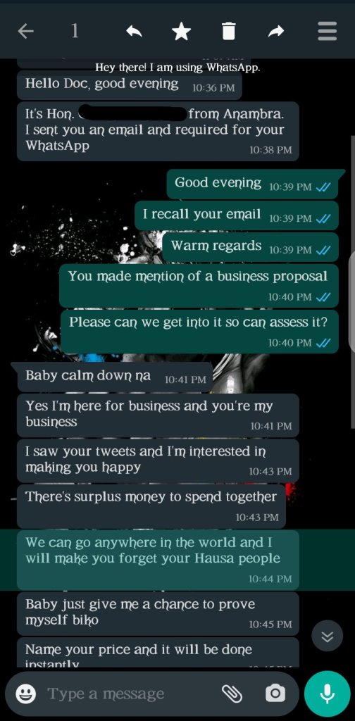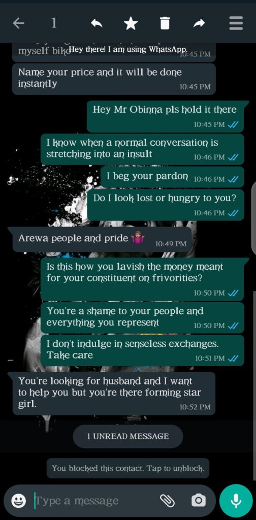She shared screenshots of the chat between herself and the said legislator who identified himself as honourable Obinna.