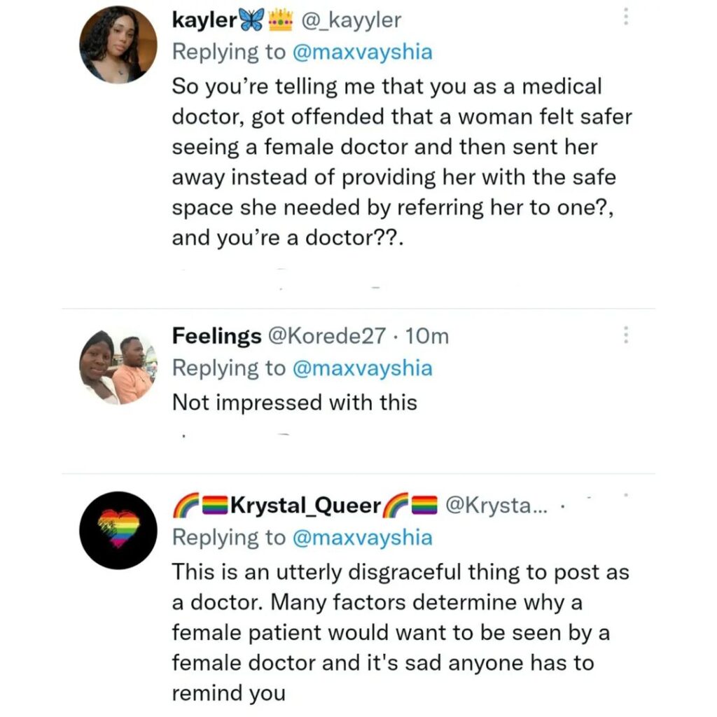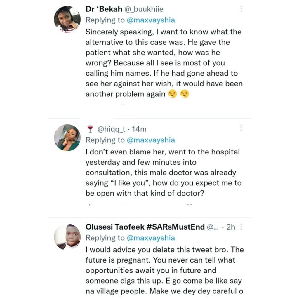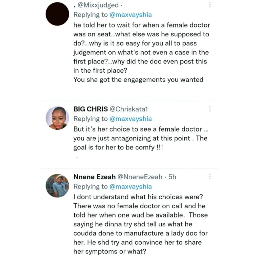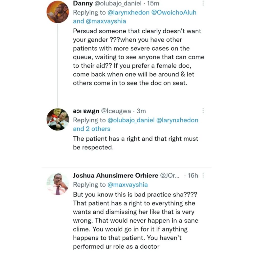 The doctor with Twitter handle @maxvayshia took to the microblogging platform to reveal that the lady came in for consultation, but refused to tell him her complaint because she was expecting to see a female doctor.