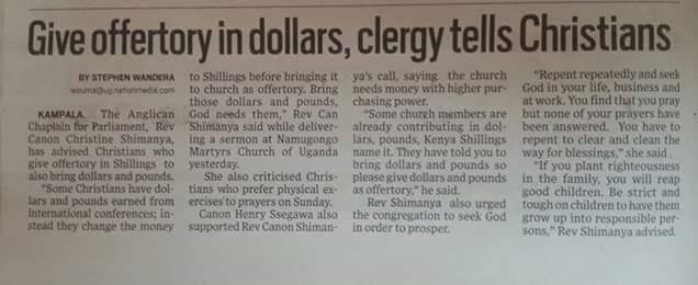 The Anglican Chaplain for Uganda’s Parliament has advised Christians who give “regular offering” in shillings (Uganda’s Local Currency) to up their givings, to dollars and pounds. DailyMonitor Reports.