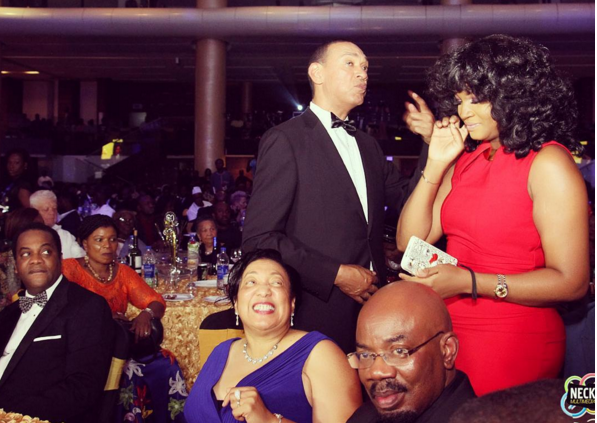 So, pictured above is Common Sense Senator, Ben bruce, His wife Evelyn (in Blue) and Former Cross River State Governor, sitted Donald Duke (Left) and yes, the delectable Omotola Jalade!