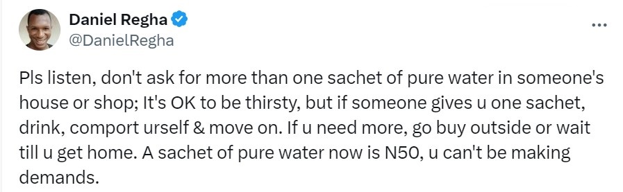 “Pls listen, don’t ask for more than one sachet of pure water in someone’s house or shop; It’s OK to be thirsty, but if someone gives u one sachet, drink, comport urself & move on. If u need more, go buy outside or wait till u get home. A sachet of pure water now is N50, u can’t be making demands.”