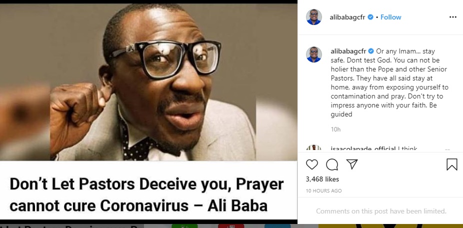 He continued in the caption: “Or any Imam… stay safe. Dont test God. You can not be holier than the Pope and other Senior Pastors. They have all said stay at home, away from exposing yourself to contamination and pray. Don’t try to impress anyone with your faith. Be guided”