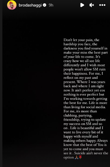 Shaggi, in a shared post via his Instastory, encouraged people not to give in to suicide no matter what they were going through.