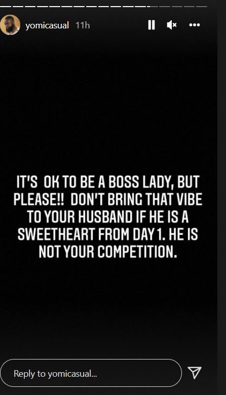 Taking to his Instagram stories, Yomi Casual advised married ladies that there’s nothing wrong with claiming “boss lady”, but they shouldn’t bring the “boss lady” mindset to their marriage as their husbands are not their competition.