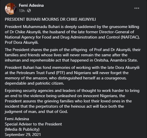 President Muhammadu Buhari is deeply saddened by the gruesome killing of Dr Chike Akunyili, the husband of the late former Director-General of National Agency for Food and Drug Administration and Control (NAFDAC), Prof Dora Akunyili.