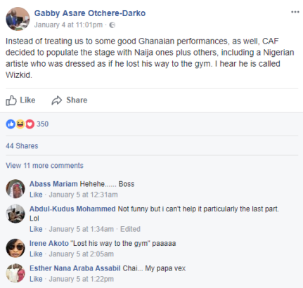 Instead of treating us to some good Ghanaian performances, as well, CAF decided to populate the stage with Naija ones plus others, including a Nigerian artiste who was dressed as if he lost his way to the gym. I hear he is called Wizkid.”