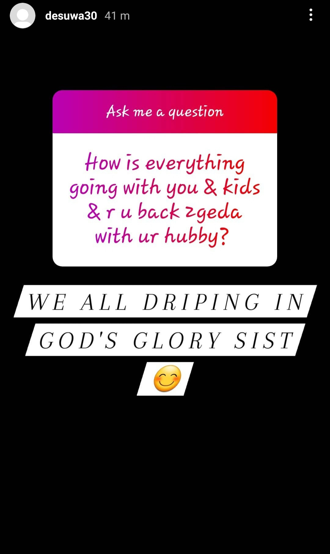 She however didn’t give a direct answer, “We all dripping in God’s glory sist”, she wrote.