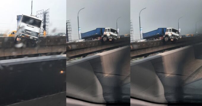 In a series of photos shared by Twitter user, Clemence Eki, a dump-truck is seen in a rather weird position on the bridge — its two front wheels had been plunged over the bridge railings while the rest of its body was on the main road.