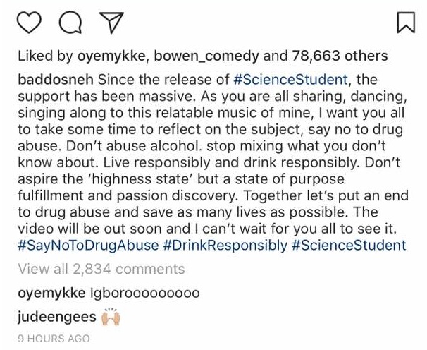 “Since the release of #ScienceStudent, the support has been massive. As you are all sharing, dancing, singing along to this relatable music of mine, I want you all to take some time to reflect on the subject, say no to drug abuse. Don’t abuse alcohol. stop mixing what you don’t know about.”
