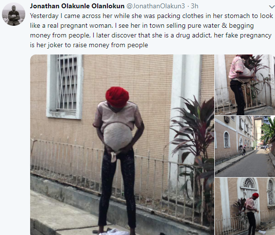 Yesterday I came across her while she was packing clothes in her stomach to look like a real pregnant woman. I see her in town selling pure water & begging money from people, I later discover that she is a drug addict, her fake pregnancy is her joker to raise money from people