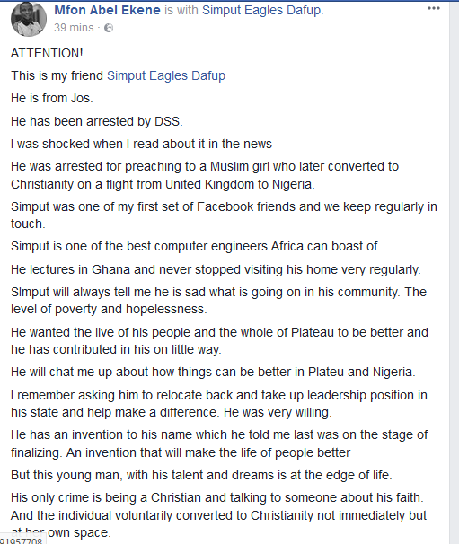 A man identified as Engineer Simput Eagles Dafup has been arrested for allegedly converting one Miss Nabila Umar Sanda Galadima from Islam to Christianity on a flight from United Kingdom. The man was arrested by the Department of State Services, DSS after a raid on his home in Jos, Plateau state.