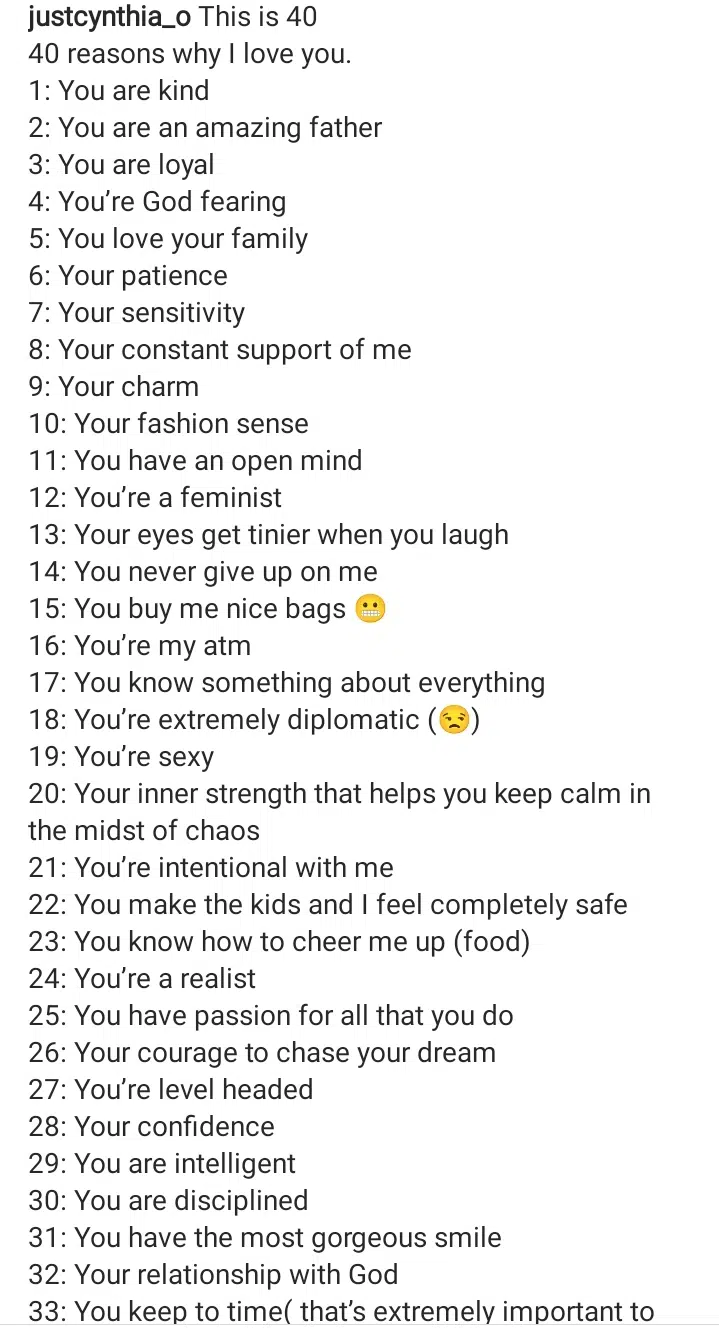 Sharing a montage of some of their beautiful moments together, Cynthia disclosed that she loves him for being kind, an amazing father, loyal, and a lover of God. She added that she loves his fashion sense, his smile, and buying her bags — just to name a few.