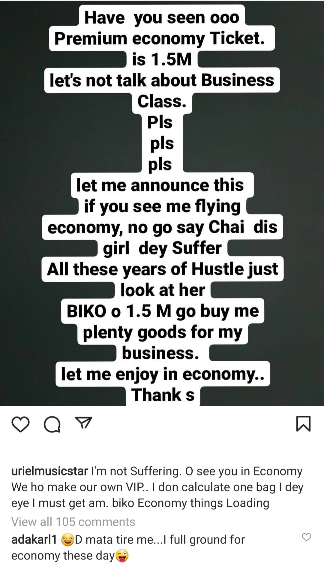 Let me announce this if you see me flying economy, no go say chai dis girl dey suffer.