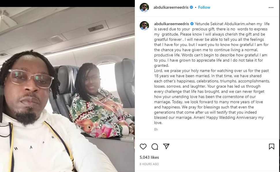 Nigerian singer Eedris Abdulkareem and his wife, Yetunde, celebrated 18 years of marriage.