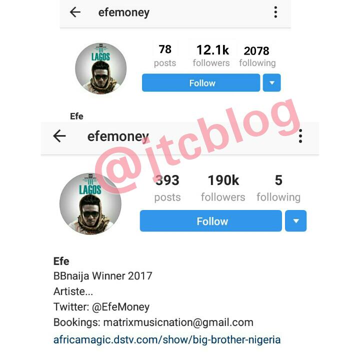 Earlier today, reports went viral that Big Brother Naija Winner, Efe unfollowed over 2000 Instagram users he was previously following.