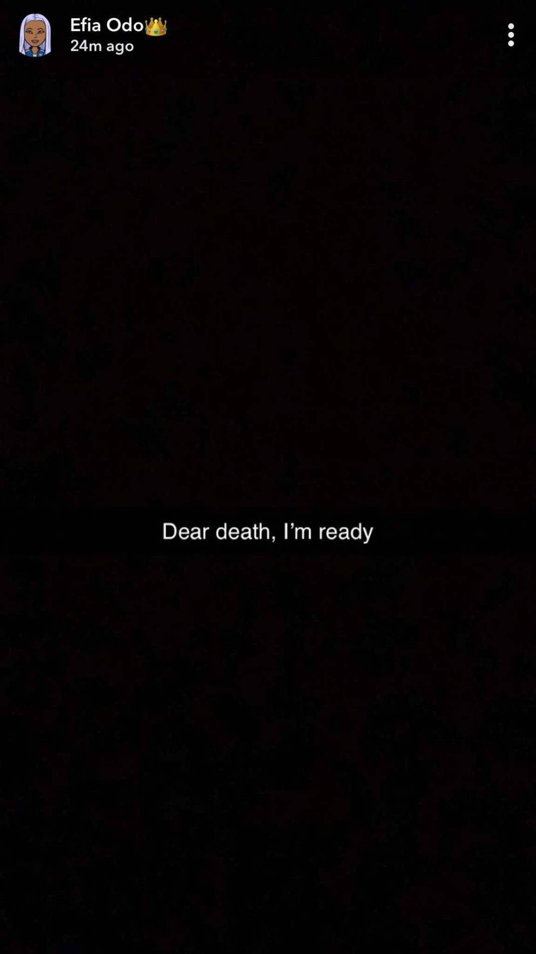 Efia Odo who threatened suicide over report of the alleged party with Shatta Wale and late Junior US, wrote on Snapchat “DEAR DEATH, I’M READY”.
