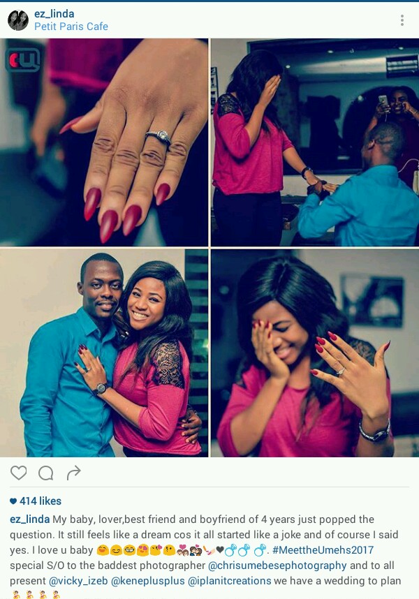 “My baby, lover,best friend and boyfriend of 4 years just popped the question. It still feels like a dream cos it all started like a joke and of course I said yes. I love u baby.” (sic)