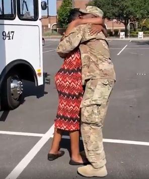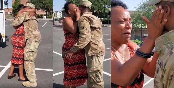 A quite emotional moment a US Army National Guard Sgt surprised his mother at work, after just returning from an assignment abroad, was captured on camera and has melted the hearts of many.