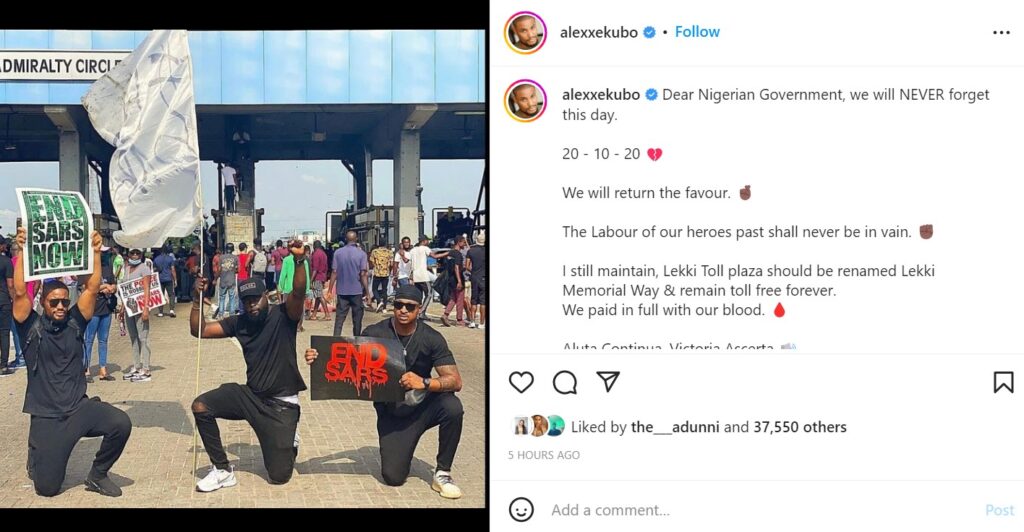 Alex took to his Instagram page to make this call and demanded that the Lekki Tollgate should be toll free, because Nigerians already paid the price in full with their blood during the tragic incident.