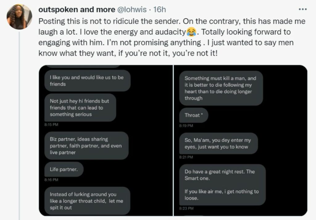 “Posting this is not to ridicule the sender. On the contrary, this has made me laugh a lot. I love the energy and audacity. Totally looking forward to engaging with him. I’m not promising anything . I just wanted to say men know what they want, if you’re not it, you’re not it!“