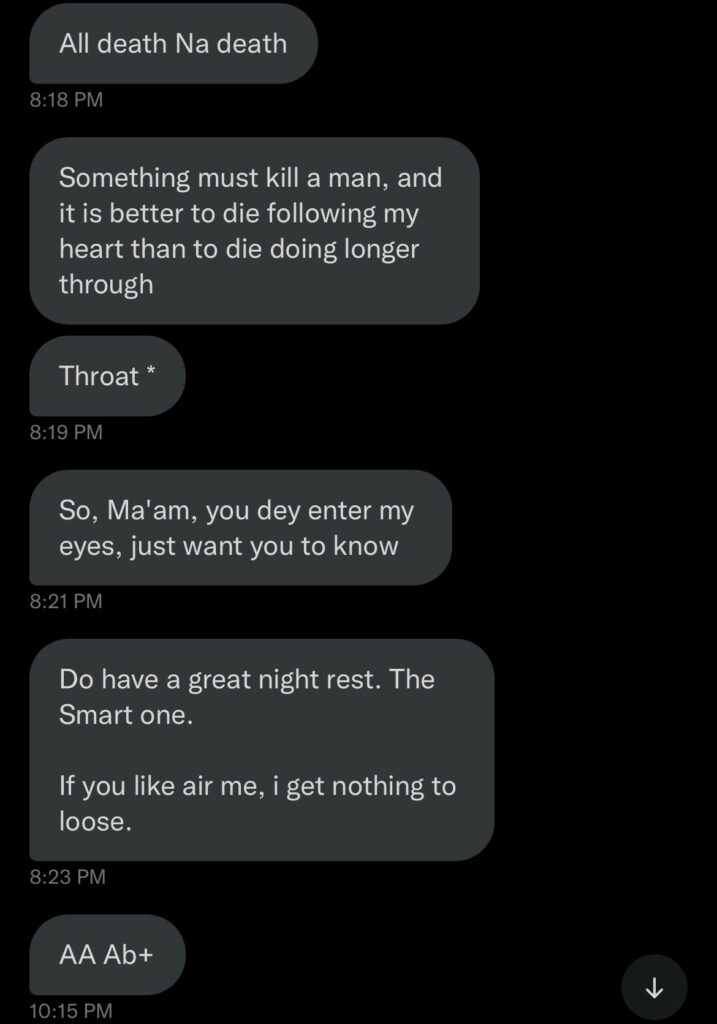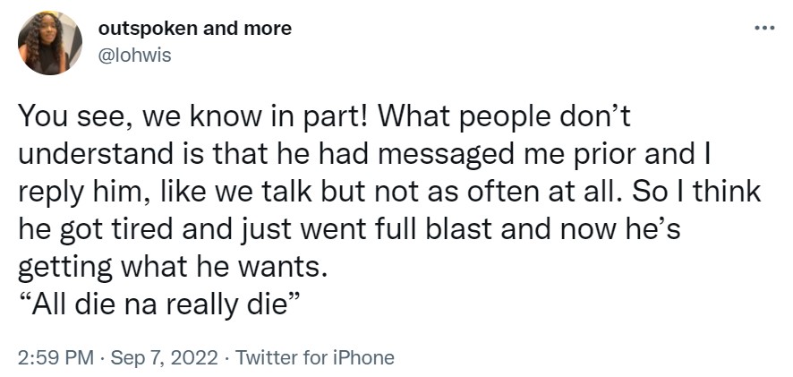 “You see, we know in part! What people don’t understand is that he had messaged me prior and I reply him, like we talk but not as often at all. So I think he got tired and just went full blast and now he’s getting what he wants.