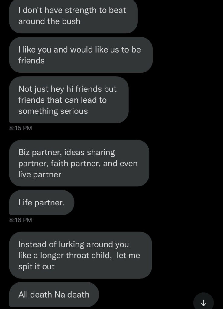 In a follow-up tweet, she disclosed that the man is not a complete stranger as they were casual friends before he sent the messages.